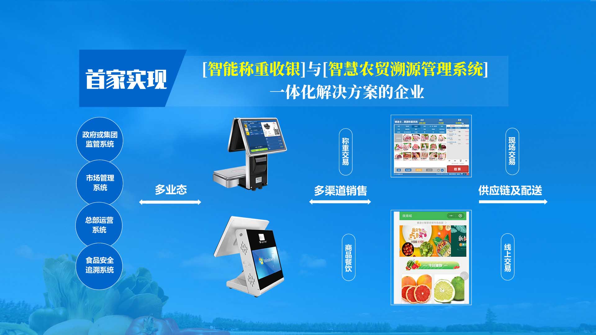 創(chuàng)新實現(xiàn)了【智慧農(nóng)貿(mào)溯源管理系統(tǒng)】與【智能稱重收銀】一體化解決方案,集市場管理、運營管理、溯源追溯、智能收銀大數(shù)據(jù)運用于一體,硬件、軟件與管理系統(tǒng)完美結(jié)合。適用于農(nóng)批、農(nóng)貿(mào)市場蔬菜、生鮮、水果、水產(chǎn)、肉類、熟食等稱重和非稱重銷售;由于采用一體化設(shè)計,解決了傳統(tǒng)農(nóng)貿(mào)市場無法實現(xiàn)的信息化、智能化、可追溯的管理問題;使稱重、收銀、追溯、管理、更透明、公正、安全,讓顧客無后顧之憂,給管理工作帶來極大的便捷與高效,對國內(nèi)農(nóng)產(chǎn)品行業(yè)的發(fā)展、農(nóng)產(chǎn)品流通管理起到了典范作用。