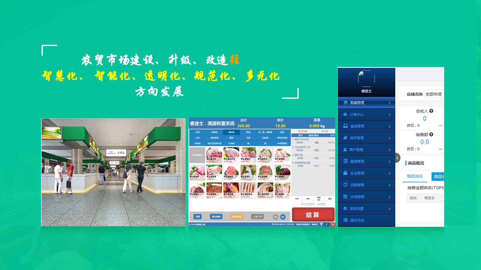 【睿途士首創(chuàng)】顛覆傳統(tǒng)的“智慧農(nóng)貿(mào)市場系統(tǒng)”,解決了傳統(tǒng)農(nóng)貿(mào)系統(tǒng)單一安卓掛屏,昂視不方便看、不直觀、無互動性,傳輸信息不齊全、不穩(wěn)定的問題,也解決了按鍵電子秤商品難找、商品代碼難記、按鍵操作不靈活、支付不智能,對收銀管理、銷售商品、菜名、菜價、打折、優(yōu)惠、會員、線上下單、采購等無法實現(xiàn)實際菜品交易和追溯等問題。